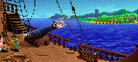 Herman will come and bug you again. When you've finished talking to him go over to the rock on it's own. Push the rock, and it will hit the catapault below. It will then be sent flying over the island, and smash your boat. Your crew are gonna be pretty annoyed! You do not need to do this to complete the game but it does add some humour at the end. Another gag here that isn't essential to do is on the far right of the screen, walk there.