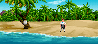 Get up, and you will stop smouldering. Look around, you finally made it! You are on Monkey Island! There are a lot of memo's and letters left around the island, and when you see them I recommend picking them up and reading them. They are written by Herman Toothrot (the islands very own hermit), some cannibals (that live on the other side of the island), and LeChuck. The letters describe feuds between the three parties. Although not needed to complete the game, these memos will inform you of events that have happened which will relate to puzzles you need to complete.
