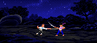 When you eventually get to the house (which is actually a gym), knock on the door and persuade the man inside that you have what it takes to learn how to swordfight. He will then take you in and your training session will begin. After you have been trained, you will have to get some experience. To do so, leave the scene so that the map of Melee is showing. You will see plenty of pirates walking along the many roads. What you have to do is keep clicking on a pirate until Guybrush and the pirate are filling up the same space on the map. You will then start talking to the pirate. Tell him to "prepare to die!" and the sword fight will begin.