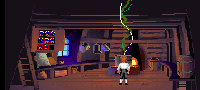 Wait until the cook comes out of his kitchen and walks past the curtain. When he has done so, slip through the door. You are in the kitchen of The Scumm Bar. Don't worry, the cook won't come in and throw you out. Pick up the pot, underneath the preparation table, and the hunk of meat on the top. Then go out onto the jetty and to the bottom right, where you will find a loose plank. When you step on it, the seagull that is feasting on a discarded red herring will be smacked into the air. Continue stepping on the plank until the bird soars into the air and takes it's time to come back down again. During this time you can pick up the red herring and leave the jetty. You can mess about with the meat and the cooking pot, but it is not essential. Also, if you ever loose the meat you can come back to the kitchen and there will be some more at your disposal.